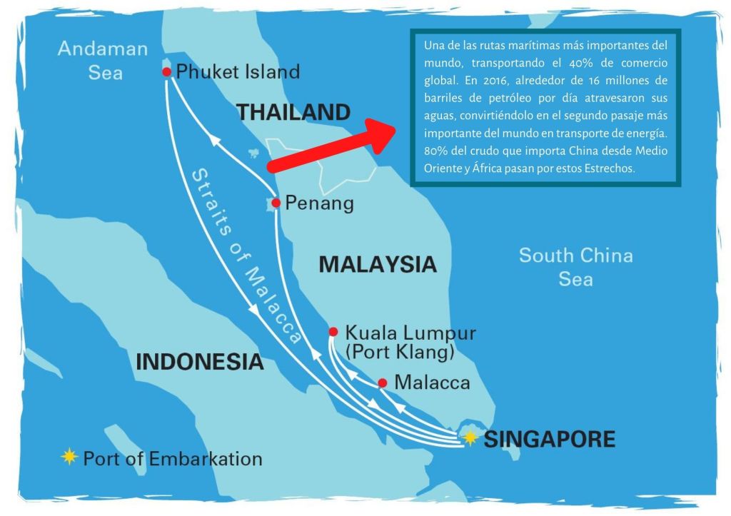 A ello hay que sumar el estratégico estrecho de Malaca, donde la competencia hace que se sume a India para controlar sus puertas junto a China, y esta circunstancia también hace que India haya cambiado instrumentalmente su discurso y propuestas para Pakistán con la finalidad de contener una China demasiado poderosa ahora por tierra a través de Afganistán, y contenerla estrangulando el estrecho de Malaca.