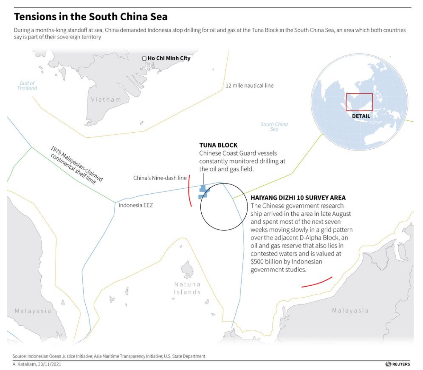 Los datos e imágenes revisados por la AMTI y la Iniciativa de Justicia Oceánica de Indonesia (IOJI), un grupo de reflexión independiente con sede en Yakarta, muestran que un buque de investigación chino, el Haiyang Dizhi 10, llegó a la zona a finales de agosto, y pasó la mayor parte de las siete semanas siguientes moviéndose lentamente en un patrón de cuadrícula del adyacente D-Alpha Block, una reserva de petróleo y gas también en aguas disputadas, valorada en 500.000 millones de dólares por estudios del gobierno indonesio, con lo que, atendiendo al patrón de movimiento, la naturaleza y la propiedad del buque, parecía que estaba realizando un estudio científico de la reserva D-Alpha".
