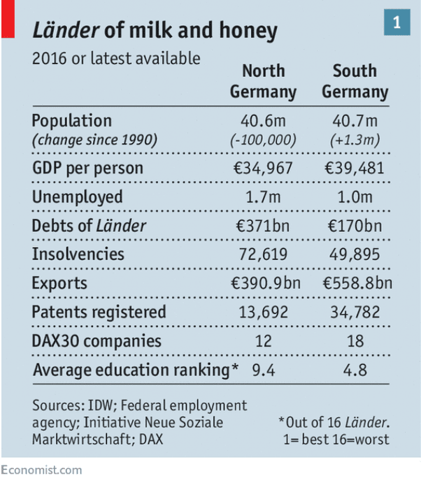 Evidentemente, las antiguas regiones mineras de carbón del Sarre y las aldeas sajonas agotadas por la política nacionalista no se ajustan a la imagen, y las ciudades del norte de alta tecnología como Hamburgo y Düsseldorf se encuentran entre las más ricas de Europa. Parte de la disparidad se explica por las luchas del gigante Renania del Norte-Westfalia, que constituiría casi la mitad de la población del Norte de Alemania, y el enorme éxito de Baden-Württemberg y Baviera en el Sur. Pero no todo.