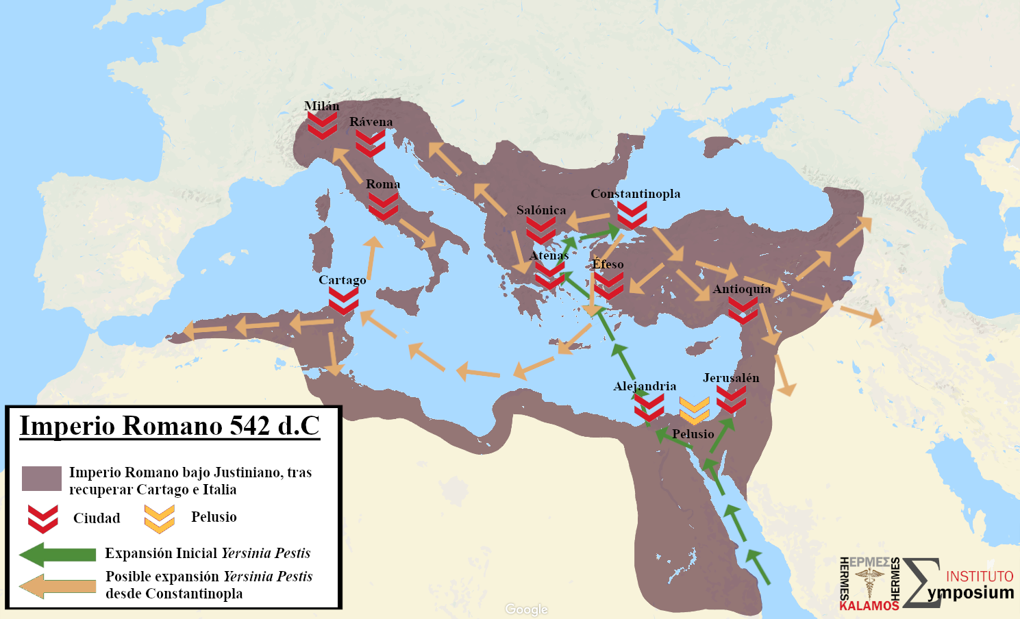 Sabemos pues, que a Roma llegó a través de los puertos del Mar Rojo, seguramente proveniente de la región de Etiopía y que a través de Egipto se expandió a lo largo y ancho del Imperio, llegando a la capital Constantinopla en la primavera del segundo año desde que tuvieron noticias en Pelusio y los dominios egipcios y desde donde Procopio será primer testigo de la misma. La transmisión tan temprana a la capital la debemos comprender conforme Egipto y ciudades como Alejandría tenían un comercio frenético con Constantinopla. Precisamente allí y gracias a las conexiones que mantenía con el resto del territorio, así como las campañas militares en Occidente primero y las hostilidades de nuevo abiertas en Oriente con los Persas después, pudo la peste expandirse dentro de las fronteras del imperio y más allá.